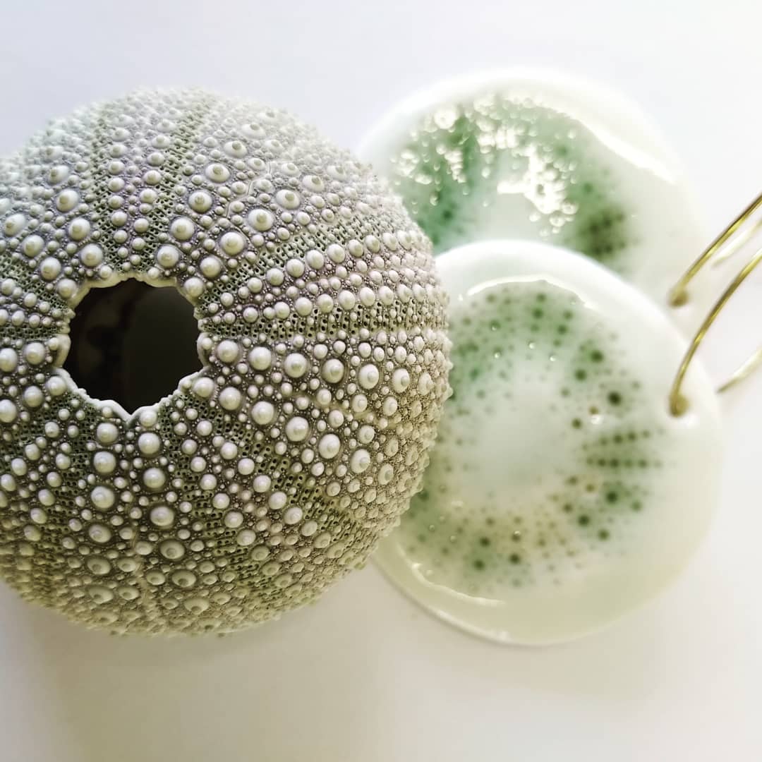 Et voici mes collections de boucles d’oreilles en porcelaine estampée et émaillée. Certaines ressemblent à du goémon, quand d’autres ont des impressions d’oursin.