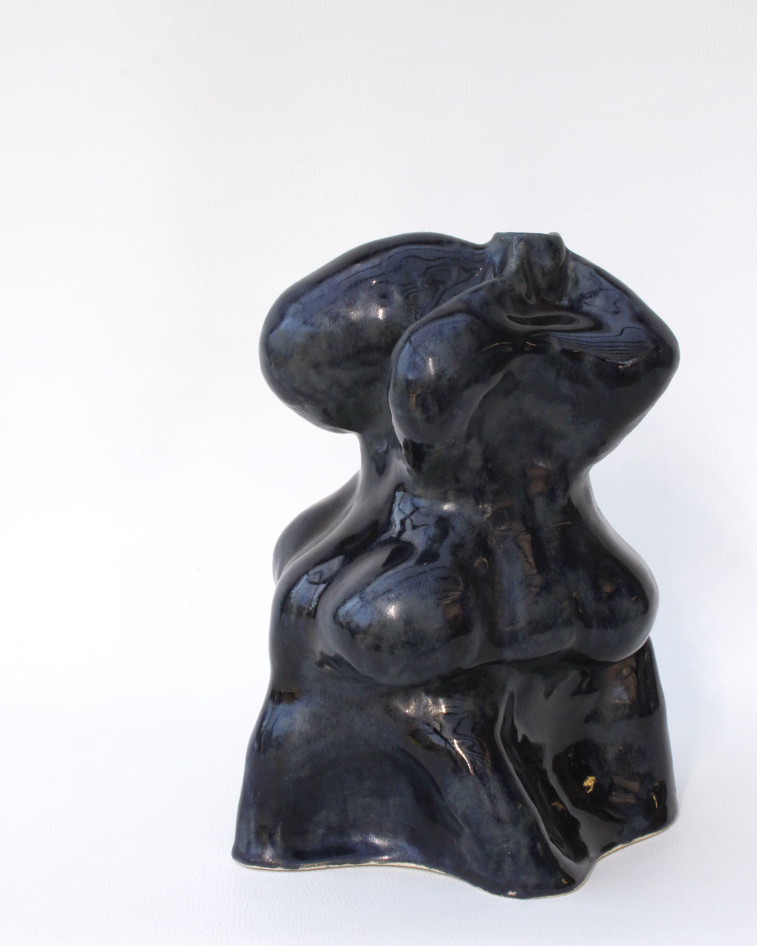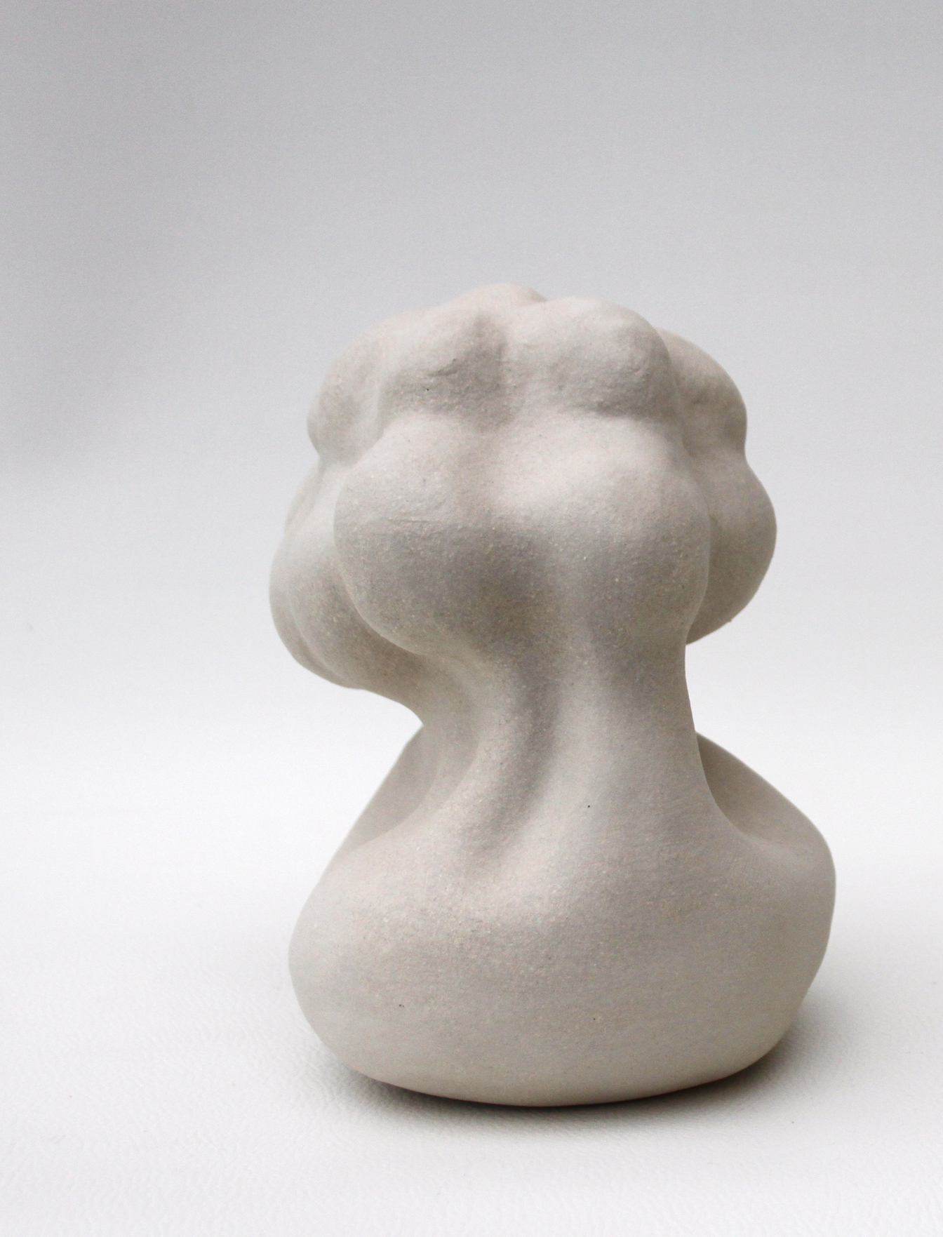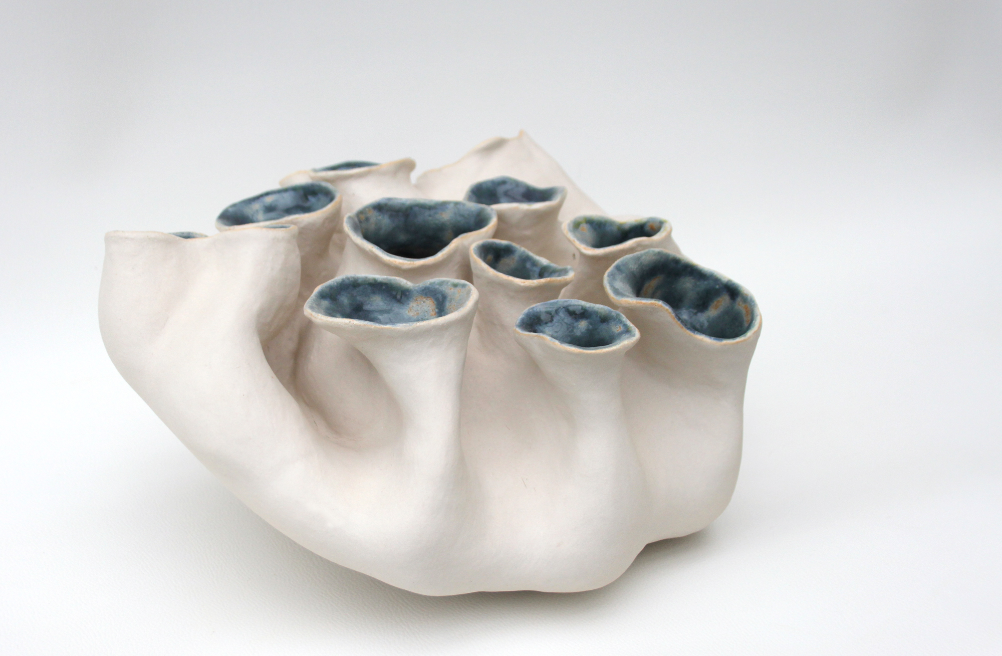 A l’aide de colombins, je fais émerger une forme creuse, un contenant. Puis du bout des doigts, avec plus ou moins de pression, je lui imprime des courbes, des plis, des excroissances. De l’intérieur ou de l’extérieur, je pousse, je déforme la terre sans plan établi. Nulle quête de perfection, mais le désir de créer des aspérités, des « aspirités » qui aspireraient le regard… Depuis quelques années, le besoin de fermer mes pièces s’est imposé à moi. La potière que je suis s’est émancipée de ses pots pour se révéler sculptrice d’un monde abstrait et organique.